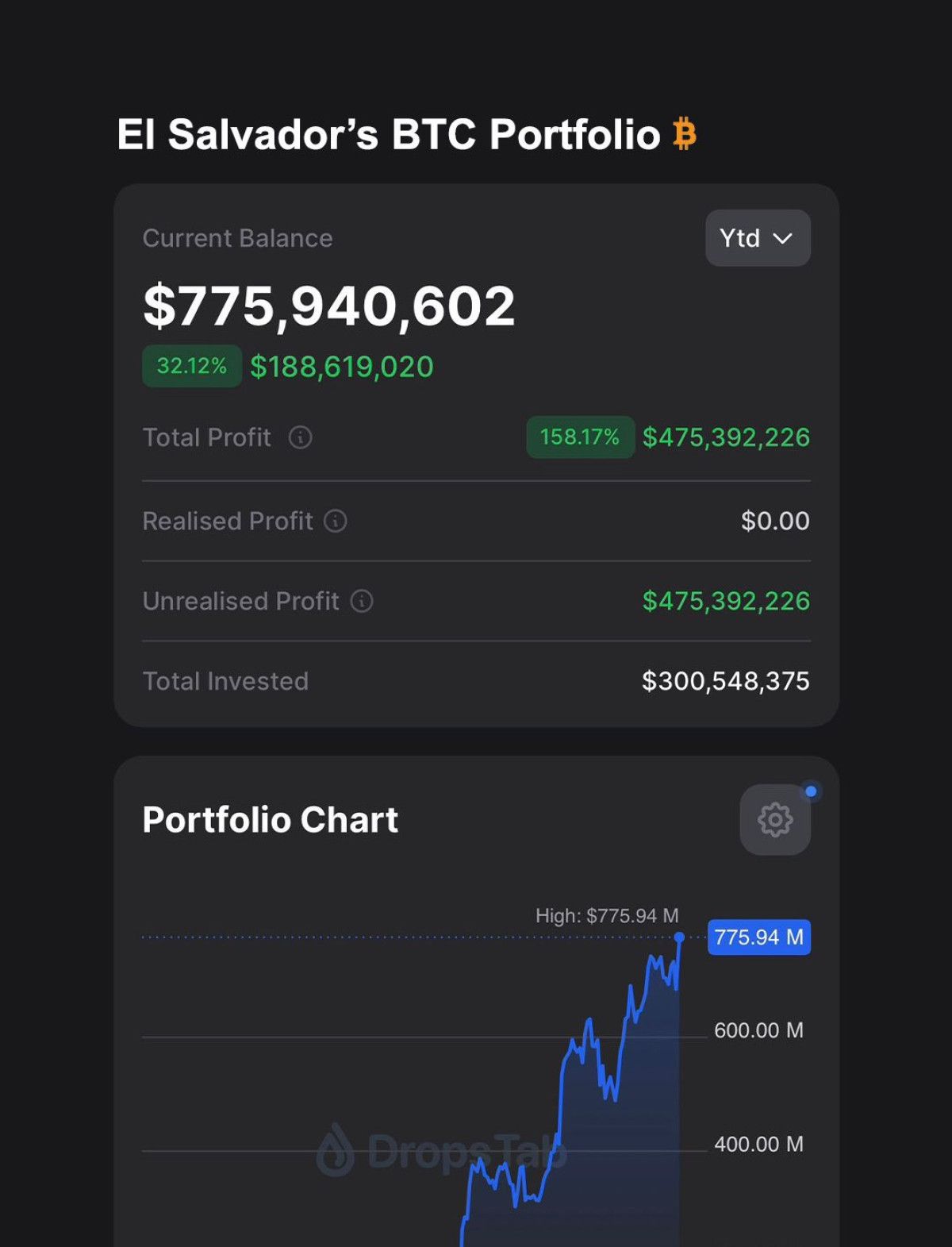 Devlet Başkanı Nayib Bukele, El Salvador’un Bitcoin rezervini açıkladı ve 475 milyon dolarlık gerçekleşmemiş kârı ortaya çıkardı. El Salvador’un Bitcoin (BTC) portföyünün toplam değeri 775 milyon 940 bin 602 dolar iken, toplam yatırım tutarı ise 300 milyon 548 bin 375 dolar olarak belirlendi. Toplam kâr (unrealised profit) miktarı ise 475 milyon 392 bin 226 doları buldu. Ayrıca, toplam kâr oranı %158,17 olarak gerçekleşirken, yılbaşından bu yana artış oranı ise Yüzde 32,12 yani 188 milyon 619 bin 20 dolar oldu.